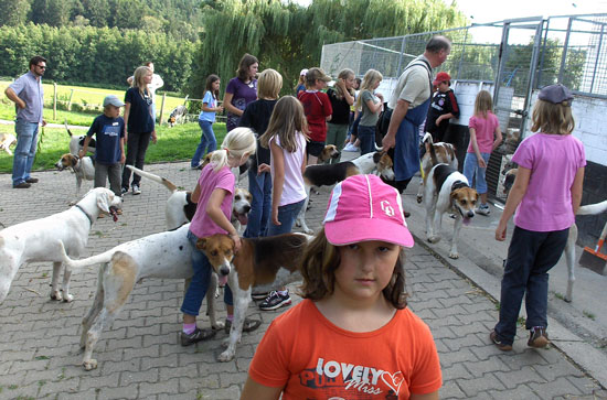 Nach guten 1 1/2 Stunden Spaziergang mit den Hunden wurden die Hunde wieder ihrem Kennel zugeordnet einsortiert. Die einen laufen gleich selbst rein, die anderen müssen geführt werden. Die Streicheleinheiten waren so schön, da konnte sich mancher Hund kaum trennen. Die Kinder halfen mit und verabschiedeten sich von Whisky, Romy, Tosca, Willi, Odette....... Einige kommen sicher wieder - im nächsten Jahr.