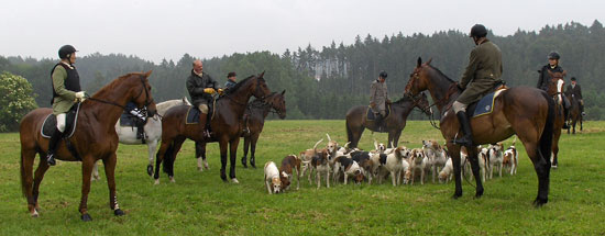 Der Sandboden in dieser Gegend schluckt das Wasser gut, aber diesmal hatte er es nicht ganz geschafft und die Wiesen waren ganz schön rutschig. Leider glitt ein Pferd aus und die Reiterin verletzte sich. Alle anderen kamen mit dem Gelände gut zurecht und es ging flott über die Strecke und die Vielzahl der Hindernisse.  Toni Wiedemann hatte wieder eine schöne Route rund um Gundelsdorf ausgewählt.  Die Foxhounds liefen wie geschmiert. Jeder kam auf seine Kosten. Alle waren begeistert, besonders auch die neu Hinzugekommenen und das trotz der erheblichen Regengüsse. Die Jagdbläser „Freischütz Schwaben“ begleiteten das Jagdgeschehen mit ihren schönen Weisen und ließen es sich nicht nehmen, auch im nassen Gelände Aufstellung zu nehmen. Zum Halali überreichte die Jagdherrin einen besonders schönen Bruch und eine Rosette mit bedrucken Bändern.  Ein von den Teilnehmern begehrtes Andenken an die Jagd. Bei Wustsalaten und Getränken, Kaffe und Kuchen wurde noch viel geplaudert. Wir freuen uns schon auf die nächste Jagd (bei jedem Wetter) und auf die dritte Frühjahrsschleppe der Familie Westphal/Bierl. Horst Fritscher