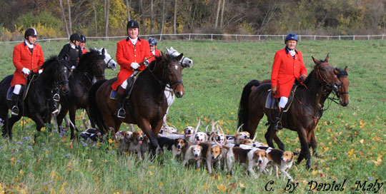 3. Nov. 2009 Hubertusjagd um Schloss Grünau Einen schöneren Jagdtag hätte man sich nicht wünschen können: Kühl und trocken, bewölkt und sonnig, die Böden griffig wie selten zuvor. Den Regen des Vortages hatte der ausgetrocknete Untergrund aufgesaugt. Bequem durften wir diesmal auf der Wiese gegenüber dem Schloss auf der Wiese parken. Beim Betreten des Schlosses wurden wir ein zweites mal überrascht. Über einen Seitenturm mit einer alten gewendelten Treppe gelangten wir in einen Saal, der dezent aber sehr gelungen renoviert worden war, richtig zum Wohlfühlen. Dank dem Haus Wittelsbach! Nach dem üblichen Jagdfrühstück sattelten wir die Pferde und ritten sie auf dem Damm ab, der sich rund um das Schloss erstreckt. Früher war das Schloss von Wasser umgeben, um es vor Übergriffen zu schützen.  Nachdem Toni Wiedemann mit Equipage und der Foxhoundmeute eintraf versammelten wir uns vor dem Schloß. Jagdherr Toni Göbel begrüßte uns und Toni Wiedemann eröffnete mit einem dreifachen Horrido und dem Ruf „die Hunde voran, packen wir´s an, Bayern Pack ran“ die Schleppjagd.  Auf gewundenem Pfad durch den Auwald wurden die Jagdpferde auf ihre Wendigkeit geprüft und mit einem Bergabsprung auf ihr Vertrauen, bevor wir uns auf der Wiese vor dem Schloss über breit angelegte Baumstämme nochmals den Zuschauern präsentierten.  Ab gings wieder in den tiefer gelegenen Wald, von dem aus wir uns mit einem Bergaufsprung und einem Sprung ins Freie verabschiedeten.