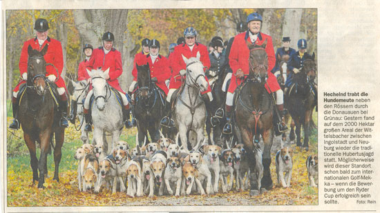 Die Wirtschaftsgebäude kamen in Sicht und damit die Pause mit Glühwein und Lebkuchen. Auch an diesen Gebäuden wurde großflächig renoviert, eine Augenweide für die Besucher und ein prächtiges Ambiente für unsere Schleppjagd. Nach weiteren Runs und über den traditionellen Wagensprung gelangten wir glücklich und zufrieden mit dem herrlichen Jagdtag zurück ins Schloss und saßen noch lange in fröhlicher Runde. Horst Fritscher Daniel Maly hat zahlreiche, tolle Fotos gemacht. Das komplette Werk kann man als CD für 20,-- Euro bestellen. Daniel Maly, Ottmarshauserstr. 120, 86356 Neusäß, Tel. 0821/488424, Mobil 0173/9450856 Titelbild der Aichacher Zeitung (Donaukurier) am 04.11.09