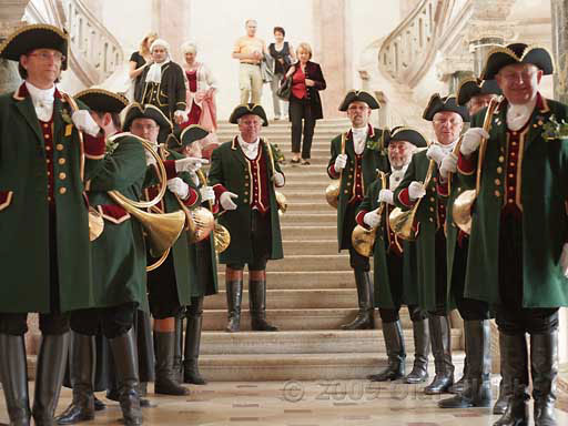 Bilder und Bericht zur Veranstaltung 2008 6. Sept. 2009: Historische Jagd- und Kutschengala vor der barocker Kulisse des Schleissheimer Schlossensamble  Bereits im Vorjahr aus Anlass der 850-Jahr-Feier der Stadt München hatte Toni Wiedemann, Präsident und Master des Bayerischen Schleppjagdvereines seine Idee in die Tat umgesetzt und zusammen mit dem Bayerischen Reit- und Fahrverband eine historische Jagd- und Kutschengala auf Schloß Schleißheim veranstaltet. Nachdem die Veranstaltung sowohl bei den Besuchern wie auch bei den Fahrern großen Anklang gefunden hatte einigte man sich darauf, die Veranstaltung auch dieses Jahr wieder gemeinsam zu organisieren. Die Vorführung einer hinter der Hundemeute gerittenen Jagd vermittelt den Zuschauern die anspruchsvolle sportliche Herausforderung einer Zeit, in der der Begriff Sport noch völlig unbekannt war. Besonders für die bayerischen Kurfürsten und ihre Hofgesellschaft war es Vergnügen und Fitnesstraining zugleich, in den ausgedehnten Wäldern um München dieser Passion nachzugehen. Toni Wiedemann mit Equipage stellte die Foxhoundmeute des Schleppjagdvereins in bester Manier vor und das Jagdfeld folgte ihm durch den herrlichen Schlosspark, den Alleen entlang und an der Gartenterrasse des neuen Schlosses vorbei.