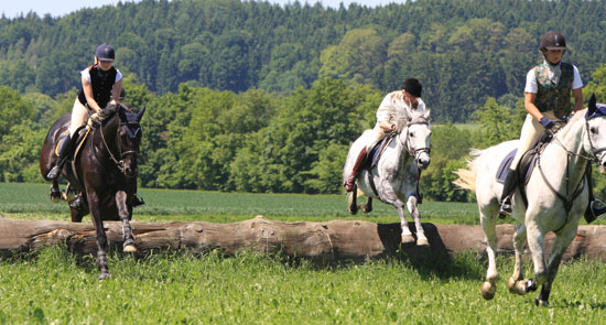 Und so ging es voran in dieser abwechslungsreichen hügeligen Landschaft über Feldwege, eigene Wiesen mit Hindernissen bestückt, an mit Sprüngen versehenen Waldrändern.