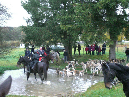 Die Hindernisse waren gut platziert, einladend und fair gebaut, der Boden trotz des nassen Wetters griffig. Das Wetter war optimal für die Hunde: kühl, feucht, nieselig – sie waren also sehr schnell – manchmal etwas zu schnell! Toni hatte 17 ½ Koppeln mitgebracht – auch die 5 Junghunde aus dem letztjährigen A-Wurf liefen problemlos. Die Schleppe wurde von Dr. Rainer Grassler und seiner Enkelin Katharina Schneider gelegt, das Feld wurde von Walter Strohm bestens geführt. Die Jagd verlief unfallfrei – das Pferd, das sich beim Satteln selbstständig gemacht hatte, konnte nach einem abenteuerlichen Run über die B 28 wieder eingefangen werden.