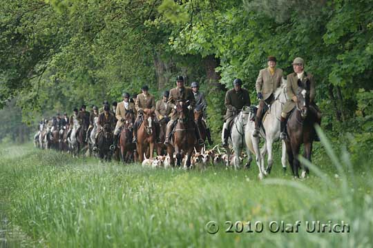 29. Mai 2010 Neumarkt/Opf. Leo´s Mühlenjagd Der Langzeitregen hatte ein Einsehen und schenkte uns an diesem Jagdtag wolkig sonniges Wetter bei geradezu warmen Temperaturen. Während anfangs die Teilnehmer zögerlich eintrafen, fanden sich nach dem Jagdfrühstück mit Leberkäs und mancherlei Getränken auf der Wiese eine stattliche Anzahl von über vierzig Pferden ein.  Jagdherr Leo Peukert hatte uns an der Einfahrt mit dem Fahrrad empfangen und wies uns schöne Parkplätze an der Schlierfermühle zu. Ansonsten übernahm die Familie (drei Generationen!) den Empfang und die Bewirtung und wir fühlten uns wie zu Hause. .jpg) Vor dem Abritt stellten wir uns im Halbkreis um Toni Wiedemann mit Equipage und der Hundemeute auf.  Toni begrüßte uns mit launigen Worten und dankte dem Jagdherrn für die Einladung. Leo wies uns in die Jagd ein. Da er sein 27 Jahre altes Pferd nicht überanspruchen wollte übernahm er die Schleppenführung und übertrug die Feldführung mit seinem neuen Pferd seinem Sohn Christian. .jpg) Zum Aufwärmen bewegten wir uns auf altbewährtem Terrain am Kanal entlang auf dem Uferweg unter dem herrlichen Baumbestand, der den Weg einsäumt. .jpg) Dort und auf der gesamten Jagd konnten wir den späten Frühling in frischem Grün aller Schattierungen genießen. Auf bestem Geläuf, absolut staubfrei, bewegten wir uns aufmerksam auf gewundenem Pfad durch den Wald. Auch unserer Foxhoundmeute kam das Geläuf entgegen. Wie immer in bestem Trainingszustand von Toni Wiedemann mit Equipage präsentiert, legten sie ein rasantes Tempo vor. .jpg) Dazu tauchten immer wieder jagdgerecht kompakte Hindernisse auf . Am bekannten massiven schwarzen Baumstamm mit Unterbau hatten sich die Fotoapparate postiert und alles lief wie am Schnürchen. .jpg)