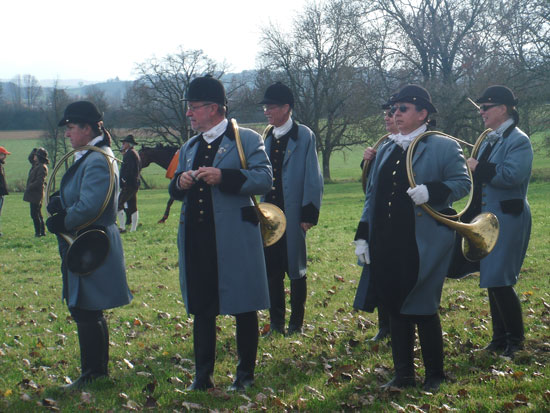 6. Nov. 2010 Erste Herbstjagd auf Gut Waitzacker / Weilheim Bereits im Juli hatte Fr. Dr. Annelie Gröber zum Jagdtraining für zwei Tage geladen. Die Veranstaltung hatte bei den Jagdfreunden großen Anklang gefunden.  Am 6. November 2010 startete nun die erste Herbstschleppjagd auf Gut Waitzacker. Umgeben von schier endlosen Weideflächen konnten die Anreisenden schon von weitem das imposante Gut erblicken. Die Gebäudetrakte in architektonisch sehr ansprechender Weise errichtet: Gutsgebäude, Wirtschaftsgebäude und eine eigene Kapelle bilden ein harmonisches Ensemble. Vor dem Gut konnten wir großzügig und ohne Gedränge parken. Anschließend gelangten wir durch das Eingangstor in einen großen Innenhof und von dort in den Gutshof. In den Vorräumen war bereits das Jagdfrühstück gerichtet. Kaffee und Kuchen, Weißwürste mit frischen Brezen, Käseplatten, Getränke aller Art einschließlich Sekt und Wein. Hier empfing uns auch Frau Dr. Gröber und drückte ihre Freude über das zahlreiche Erscheinen aus. An die vierzig Pferde warteten in den Hängern auf ihren Einsatz. In einem schönen, frisch renovierten Saal nahmen wir das Jagdfrühstück ein. Unsere Jagdbläser „Anjagd“ stimmten uns auf die Jagd ein und wir fühlten uns sehr wohl.