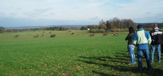 In weiten Galoppaden näherten wir uns wieder den Gutsgebäuden, überwanden nochmals die Dreifache und fanden uns wieder auf der Wiese. Alle freuten sich über die schöne und unfallfreie Jagd. Wir drückten uns die Hände zum Halali und freuten uns über den schönen Jagdtag.
