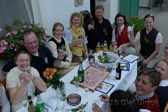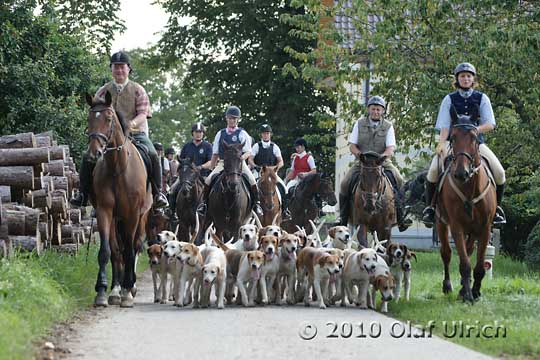 Heute, Sonntag, 8.8.10, vorletzter Tag der zweiten Gruppe. Was gibt es zu berichten. Die Gruppe ritt heute schon um 9.00 Uhr. Am Hohenrain, auf der anderen Seite der Strasse wurden Sprünge und anspruchsvolles Gelände geübt. Auf dem Heimweg dann Graben und den Wagensprung. Alles verlief ohne Faller oder Verletztung. Leider waren aber Verletzungen zu beklagen die in den Boxen passierten. Da eine Schramme, da ein kleiner Aderriss und dort eine leichte Schwellung. Jeder der ein Pferd hat weiß wie leicht so was mal vorkommt. Ja und da war noch das Pferd von der Margit das ein Eisen verloren hat. Gott sei Dank hatten wir einen Schmid mit dabei. Der Martin war so nett und nagelt das Eisen auf, zog da noch einen Nagel nach, setzte dort noch einen Neuen usw. . Die Mittagspause viel dann für die Equipage sozusagen aus. Kaum zurück und die Pferde versorgt wurde eine Gruppe Hunde aufgeladen und nach Wolnzach zum Festumzug gefahren.  Zwischen 14.00 Uhr und 16.00 Uhr begeisterten wir tausende von Menschen. (Siehe eigener Bericht) Dann gings wieder zurück zum Stall, ausladen, schnell Kaffee trinken und etwas vom Kuchen naschen, satteln und mit der Gruppe ins Gelände. Die Hunde freuten sich über zwei schöne Schleppe, wo sie sich wieder richtig auslaufen konnten. Unsere Reiter und Reiterinnen wurden wieder perfekt von Robert geführt und hatten großen Spass dabei.