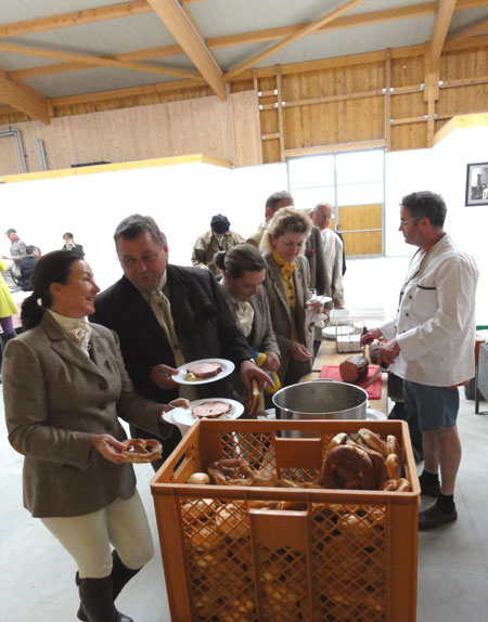 Schleppjagdverein von Bayern: 12.Mai 2012 Frühjahrsjagd Koppenzell Jagdherrschaft Frau Westphal-Bierl hatte zur ersten Jagd in unserer neuen Anlage geladen. Trotz des nassen Wetters hatte sich eine großes Jagdfeld eingefunden.  Mit einem Glas Sekt und einem ausgiebigen Jagdfrühstück wurden wir auf die Jagd eingestimmt. Toni Wiedemann übergab der Jagdherrin einen Blumenstrauß und aus dem Hintergrund erklang das Jagdhorn unseres Jagdfreundes Rudi Eberhard.  Unserer Regenkleidung konnten die leichten Schauer nichts anhaben und so gingen wir mit großer Freude hinaus in die Frühlingslandschaft mit dem vielfältigen Grün.