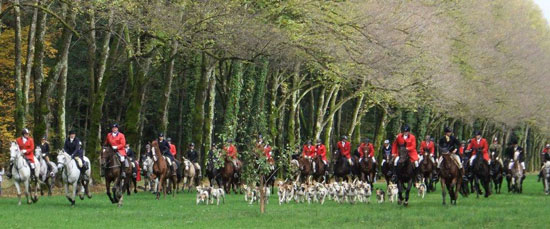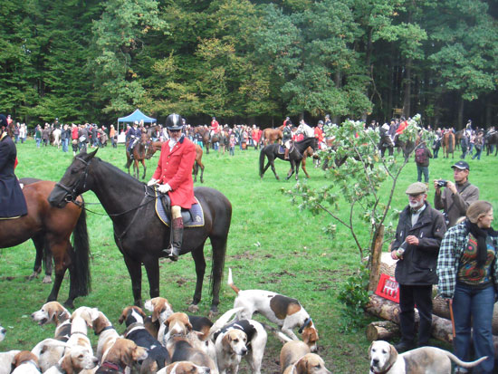 Vor der Kapelle des alten Schlosses trafen wir uns zum Stelldichein mit den Pferden und bewegten sie zur Vorbereitung auf die Jagd.     Um elf Uhr traf Toni Wiedemann und die Equipage mit unserer Foxhoundmeute ein und wir stellten uns im Rund um ihn.