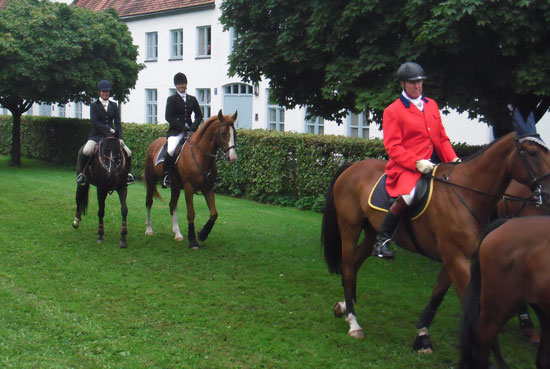 Als wir uns vom Parkplatz der Gespanne zum Frühstück am Lustschloss begaben, fragten uns die Leute wo und wann der Auftritt der Jagdreiter mit den Hunden stattfinden wird. So freuten wir uns schon auf unsere Vorführung der Schleppjagd. Toni Wiedemann entlud die Foxhoundmeute und wir ritten zur Wiese nebenan, um die Hunde und Pferde bereit zu machten für den Auftritt. Dann zogen wir hinein in das Gelände und hielten schließlich an der Rückseite des Schlosses. An der Freitreppe begrüßte uns Frau Annette Mezger und erzählte der wartenden Menge, welche Leistung der Schleppjagdverein unter Präsident und Master Toni Wiedemann mit dem Bau einer Anlage auf eigenem Grund erbracht habe. Unter dem Beifall der Zuhörer erläuterte Toni Wiedemann den Besuchern das Jagdreiten mit der Hundemeute und wies darauf hin, dass diese Veranstaltung eine große organisatorische Herausforderung darstellt. Alle Fahrer und Reiter, Barockgruppen und Schlosspfeifer, Jagdhornbläsergruppen und Damensattelreiterinnen, ebenso uniformierte Reiter und Darsteller von flanierenden Gruppen aus früherer Zeit hatten sich mächtig ins Zeug gelegt, um den Zuschauern ein breites Spektrum an Tradition darbieten zu können. Auch Profi-Fotograf Olaf Ulrich begleitete das Geschehen, um uns mit guten Bildern versorgen zu können. Nachdem wir mit den Hunden das Gelände mehrmals unter dem Jubel der Zuschauer durchquert hatten, setzte Toni Wiedemann in der langen Außenallee die Foxhoundmeute auf die Schleppe an, die sie mit lautem Geläut annahm. Das Jagdfeld folgte und im starken Galopp näherten wir uns dem Lustschloss. Dort wechselten auf die andere Seite und ließen uns wieder vor den begeisterten Zurufen der Zuschauer in gutem Jagdtempo entlang gleiten. Toni Wiedemann hatte die Foxhounds bestens vorbereitet und sie flogen zu unserer und der Freude der wartenden Menge nur so dahin. Unterstützt wurde unsere Vorführung durch die begleitenden Jagdhornbläsergruppen, unter anderen unserer Bläsergruppe „Anjagd“. Am Ende der Schleppjagd fanden wir uns nochmals an der Freitreppe ein und Toni Wiedemann drückte seine Freude darüber aus, dass die Vorführung gelungen und unfallfrei verlaufen sei, nicht zuletzt durch das disziplinierte Verhalten der Zuschauer. Zum anschließenden Halali reichten sich die Jagdteilnehmer die Hände und unter dem Klängen der Jagdhornbläser erhielten die Hunde ihre Belohnung in Form von Rinderpansen. Nach dem Verladen der Hunde und der Pferde trafen wir uns noch auf halber Strecke zwischen dem neuen Schloss und Schloss Lustheim, stärkten uns und unterhielten uns über den schönen Tag und über die kommenden Jagden. Horst Fritscher Hier traf sich die Jagdgesellschaft vor dem Aufbruch.