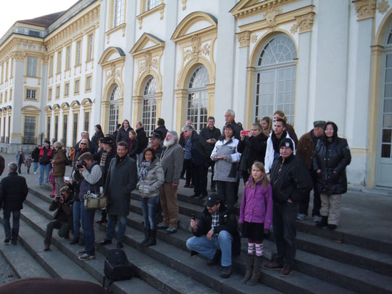 Auch die Auslöser klickten fleißig, angefangen von den kleinsten Kameras bis zu den dicksten Rohren. Wir freuen uns schon auf die schönen Bilder!  Als Toni Wiedemann mit Equipage und Foxhoundmeute vor dem Schloss einzog, wechselten wir zu ihm hinüber und empfingen ihm im Halbkreis. Die Jagdhörner erschallten und mit „Horrido“ und „packen wir´s an, die Hunde voran“ brachen wir auf, bewegten uns um das Schloss herum und nahmen Tempo auf in den herrlichen Alleen des Schlossparkes.