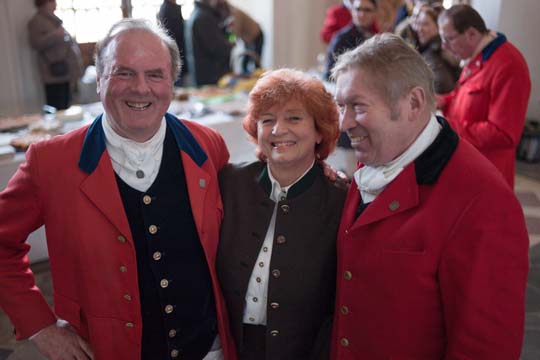 24. Nov. 2011 Jagdherren und Equipagenjagd auf Schloss Schleißheim Petrus ließ uns auch bei unserer Abschlussjagd nicht im Stich und schenkte uns unerwartet einen Spätsommertag. Die dicke Unterziehweste konnte im Auto verbleiben. Das Schloss erstrahlte nach dem Abzug der letzten Nebelfetzen im besten Sonnenschein und sorgte für Wärme und im voraus für gute Laune. Übrigens, Kurfürst Max Emanuel, der Erbauer des Schlosses war nicht nur ein Kunstmäzen (er kaufte für 90.000 brabantische Gulden 101 Gemälde, davon allein zwölf Werke von Peter Paul Rubens, die heute den Grundstock der Alten Pinakothek bilden), sondern wohl auch der erfolgreichste Kriegsherr Bayerns. Als die Türken 1683 Wien belagerten, eilte er 1889 Kaiser Leopold I. zu Hilfe und trug entscheidend zum Sieg über die Türken bei. Er erwarb sich dadurch den Ruf eines herausragenden Feldherrn. Zurück zur Jagd: Fleißige Helfer rollten Teppiche aus im Schloss, stellten Bänke und Tische auf. Die Familie Schuster sorgte für das Jagdfrühstück mit frischen Weißwürsten, würzigem Leberkäse, Bier vom Fass und Glühwein. Ein großes Kuchenbuffet füllte die bewährte Crew mit Selbstgebackenen: Brigitte, Thea, Bobby, Anni, Edith und Annemarie.