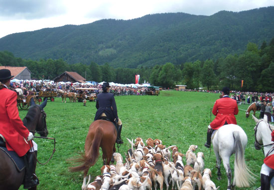 Um 10.30 Uhr waren wir am Parkplatz, um 11.00 Uhr ritten wir los und warteten dann ca. eine halbe Stunde an dieser wunderbaren Stelle auf den Beginn des Umzuges. Vor uns die Kutschen mit den Ehrengästen, Bürgermeister, Landrat usw. und dann ein paar Esel und dann die königliche Jagdgesellschaft, unsere Meute.