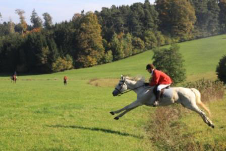 Wir wechselten auf die andere Seite in das hügelige Gelände und unversehens tauchte auch schon einer der vielen natürlichen Gräben auf, die für die Entwässerung der Flächen sorgen. Wir aber konnten uns beweisen mit einem Sprung unserer Pferde darüber. Auf den weiten Flächen verteilt tauchten immer wieder Hindernisse auf, jagdgerecht und fest gebaut und von den Pferden gut angenommen.