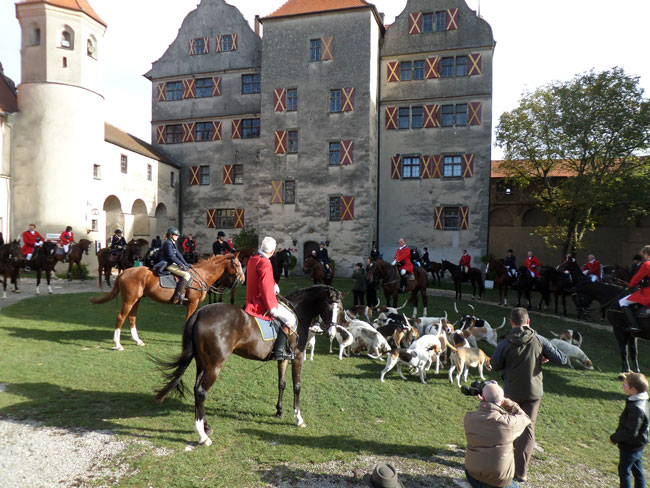 Beim Einladen zu Hause hat es bei fast jedem geregnet. Über Harburg schien die Sonne und so hatten alle ihre Freude. Das Stelldichein im Burghof ist schon ein besonderer Augenschmaus. Jagdherr Robert begrüßt das Jagdfeld.