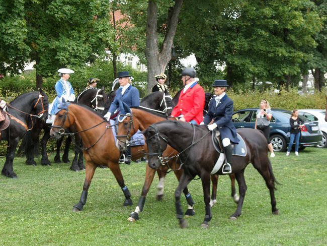 Nach dem Satteln trafen sich die Reiter auf der Wiese gegeüber des Parkplatzes. Auch die Barock Damen haben sich eingefunden. Mit ihren Friesen mit Mähnen bis fast zum Boden und schönen Kleider machten sie schon was her.