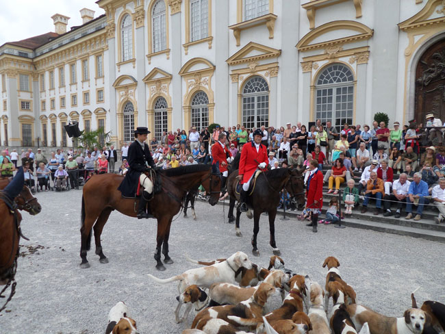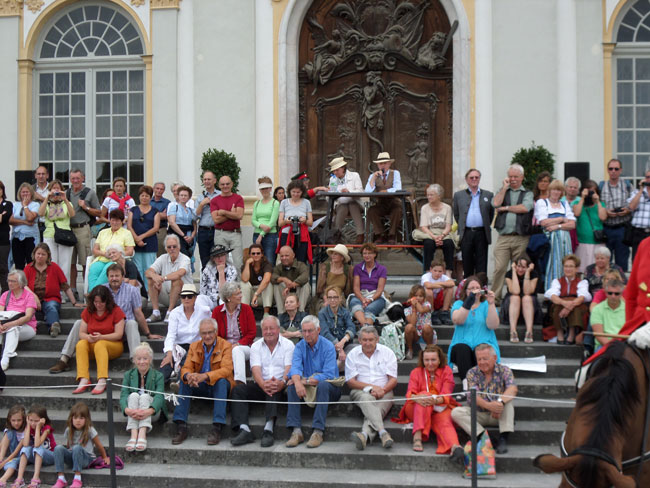 Diesen Blick genossen die Zuschauer auf der Treppe. Leider ist das Bild etwas dunkel. Die Jagdgesellschaft, im Hintergrund die Fontänen der Brunnen und dahinter Schloss Lustheim. Die Zuschauer bewegten sich im ganzen Park von Unterhaltung zu Unterhaltung.