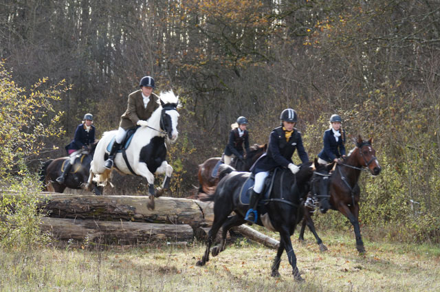 Anschließend bejagten wir das westliche Gebiet mit weiten Flächen und alten Laubwaldbestand. Der Wind ließ die Baumwipfel rauchen und das Laub raschelte unter den Hufen der Pferde. Es bildete in seiner Farbenpracht einen bunten Teppich, ein Augenschmaus für alle Beteiligten. Der Jagdherr mit seinen Helfern hatte bis spät abends vor Jagd keine Mühen gescheut um die Hindernisse jagdgerecht zu errichten, die von (fast) allen Pferden mühelos genommen wurden.