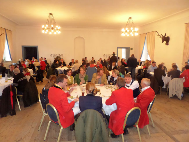 Im großen Saal im ersten Stock des Schlosses wurden wir von der Familie Göbel freundlich empfangen mit Sekt und Weißwurstessen, bevor wir unsere Pferde auf den Dämmen des ehemaligen Jagd- und Wasserschlosses abritten. Inzwischen war eine lange Kolonne von Kutschen vorgefahren. Diese Jagd ist auch stets ein großes Zuschauerereignis.