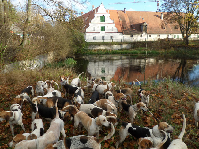 Toni Wiedemann setzt sich mit unserer Foxhoundmeute und der Equipage an die Spitze des Jagdfeldes. Wir bewegten uns zuerst auf den geschwungenen Pfaden der dichten Wäldchen westlich des Schlosses mit anspruchsvollen Auf- und Absprüngen, wobei wir mehrmals am Schloss kreuzten, vorbei an den wartenden Zuschauern in den Kutschen.
