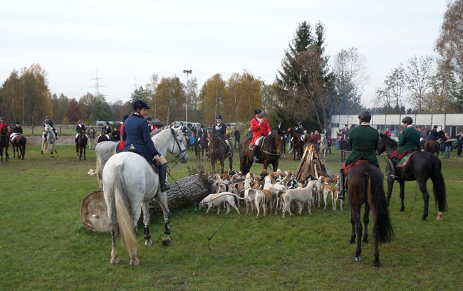 Schleppjagd in Büchelkühn war wieder ein Erfolg. Der Einladung der Pferdefreunde in Schwandorf folgten in diesem Jahr wieder zahlreiche Reiter. Nach dem leckerem Frühstück in der festlich geschmücken Halle waren wieder alle voller Vorfreude auf einen großartigen Jagdtag. Bei etwas Nebel und nach dem dreifachen Horrido ging es mit unseren zahlreichen motivierten Hunden und den über 81 Reitern los auf die langen Schleppen über die schönen Wiesen im Naabtal. Der Vorstand Hermann Stecher hatte sich mit Unterstützung der Vereinsmitglieder wieder eine sehr schöne und anspruchsvolle Strecke ausgedacht. Der Master Bernhard Schleicher und seine beiden Piköre Wolfgang Hirzinger und Peter Dirmeier führten das Jagdfeld dicht hinter der Equipage und den Hunden, so das alle Reiter die jagenden Hunde miterleben konnten. Das zweite Feld wurde von Carola Ettl und Claudia Brunner angeführt, die sich den Nichtspringern und Anfängern sehr gut annahmen und diese ebenfalls sehr sicher führten. Als Schlußpiköre bewährten sich die jagderfahrenen Reiter Marco Rom und Bernhard Bauer. Die rund 25 km Jagdstrecke waren wie gewohnt durch den schönen Boden mit den über 20 festen jedoch umreitbaren Hindernissen bestens für die Pferde zu bewältigen. Die Jagdhornbläser St. Hubertus umrahmen die Jagd mit Hörnerklängen und gaben schließlich das Zeichen zum Halali. Durch einen guten Braten gestärkt, traten wieder alle Teilnehmer mit strahlenden Gesichtern spät am Abend die Heimreise an. Hier ein paar Fotos von der Jagd in Schwandorf. Da wurden wir mal wieder richtig verwähnt. :-)