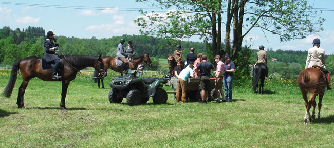 Die Hundemeute präsentierte sich in bester Verfassung und die Jagdgesellschaft mit ihren frühjahrsfrischen Pferden freute sich über die weiten und breiten Wiesenflächen, auf denen sich die Pferde so richtig austoben konnten. Wer Springen wollte, fand über die gesamte Strecke verteilt Hindernisse. Auf einer langen Bergaufschleppe konnte jeder den Trainingszustand seines Pferdes testen. Beim Zwischenstop gab es Erfrischungsgetränken die Andreas mit Anhänger brachte.