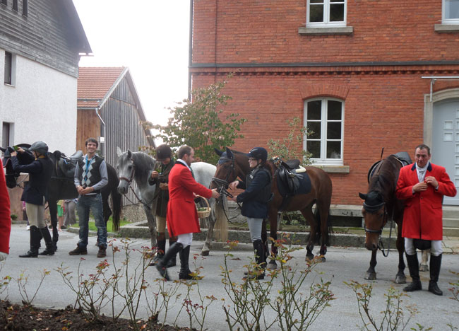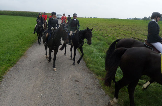 20. Sept. 2014 Schleppjagd im Lallinger Winkel Sehr erfreut war Toni Wiedemann über die Zusage von Josef Streicher für diese Jagd. Hat der Schleppjagdverein endlich wieder einen neuen Standort in Ostbayern. Und was für einen. War der "Lallinger Winkel" schon vom Hörensagen hoch gelobt, so entpuppte sich der Standort für die Jagd schlichtweg paradiesisch. Der Rodungsheilige Gunther hatte vor Zeiten mit armen Waldarbeitern die Gegend gerodet und eine freie Landschaft mitten im dichten Bayerischen Wald geschaffen. Hügelauf, hügelab erstrecken sich Felder, Wiesen und Bächlein, von Bäumen und Büschen umsäumt. Dazwischen öffnet sich eine durchgängige Landschaft, wie geschaffen für die Schleppjagd. Bei der Ankunft in Lalling wurden wir auf einen befestigten Parkplatz eingewiesen und auf die Späteren wartete eine Wiese. Nach kurzem Weg zum Zehentstadel empfing uns der Jagdherr mit dem obligatorischen Glas Sekt und bestem Jagdfrühstück. Anschließend trafen wir uns mit den Pferden an der alten Dorflinde zum Stelldichein.