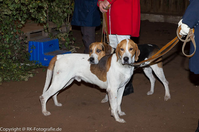 Nun hieß es Satteln und Aufsitzen. Im Halbkreis erwarteten wir Toni Wiedemann mit dem Einzug der Foxhoundmeute, begleitet von der Equipage.