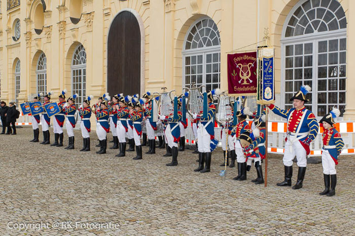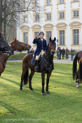 Bestens umrahmt wurde die Veranstaltung von unseren bewährten Jagdhornbläsern "Anjagd", die bei der guten Akustik im Vestibühl bestens zur Geltung kamen und uns auch auf der anschließenden Jagd im Schlosspark und im Außengelände begleitete. Petrus hatte wieder einmal Einsehen mit unserer Schleppjagd. Das kalte nebelige Rieselwetter der Vortage war vergessen und eitel Sonnenschein veranlasste so manchen die warme Weste im Auto zu lassen, um beim Ritt nicht ins Schwitzen zu kommen. So begaben wir uns zum Schloss und wurden dort von den Schleißheimer Schlosspfeifern und einer großen Menschenmenge empfangen.