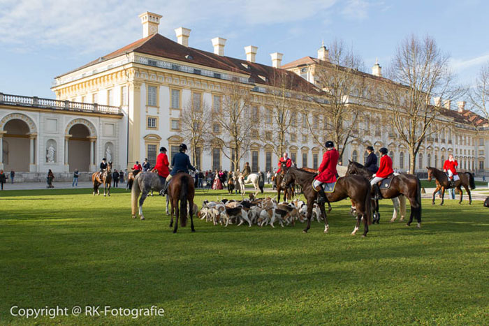 So war es kein Wunder, dass auch zur Abschlussjagd auf Schloss Schleißheim nicht nur die Jagdherrschaften und die Equipagemitglieder eintrafen, sondern auch eine überwältigende Anzahl von Jagdbeteiligten und Gästen das Vestibül des geschichtsträchtigen Schlosses Schleißheim füllten und damit die Organisatoren auf die Probe stellten.