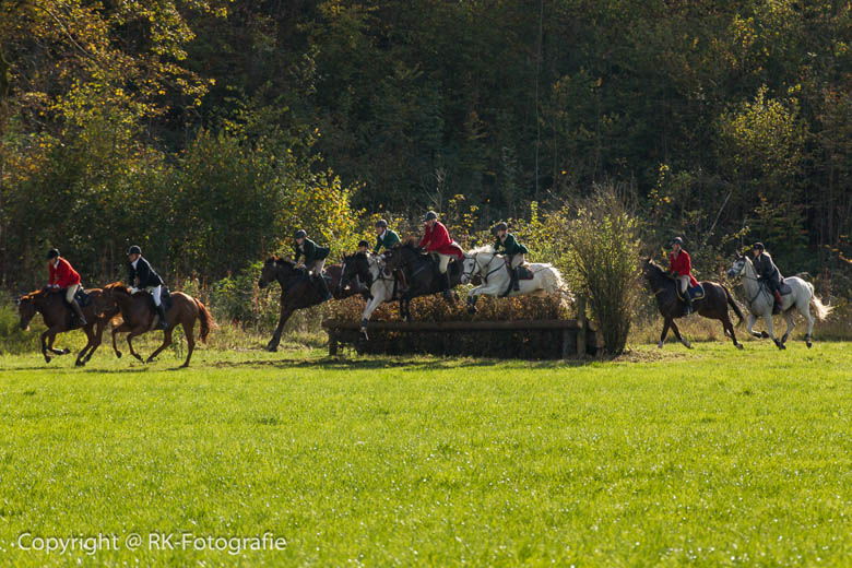Auch hier am Ende der Schleppe zahlreiche Varianten um Wassersprünge zu üben. Das Landgestüt bildet jährlich viele junge Pferde aus und für Vielseitigkeitsprüfungen durch. Deshalb wurden optimale Bedingungen dafür geschaffen.  Wieder im Gelände zurück bot sich den Zuschauern ein prachtvolles Bild. Bei strahlendem Sonnenschein wirken die Rotröcke besonders schön.