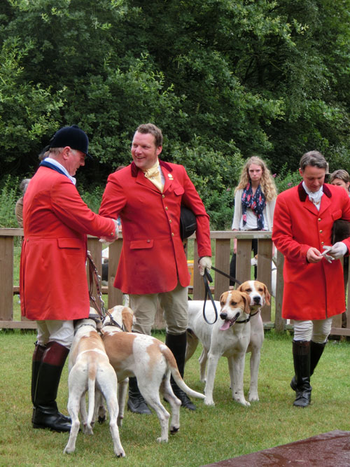 Insgesamt stellten 13 Meuten 26 Beagle und 112 Foxhounds vor. Die meisten Hunde stellte der SvB vor. 29 Hunde hatte Master Toni Wiedemann am Freitag in der Früh in den Hunde-LkW und einen Anhänger eingeladen. 27 davon stellte der Master gemeinsam mit den Equipagemitgliedern Birgit Queissner und Julia Heller vor. Unterstützt wurden die drei von Sabrina Gerber, Katja Osswald und Carola Wagner.