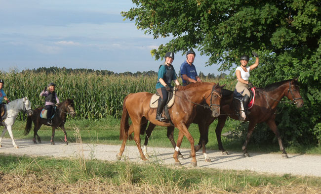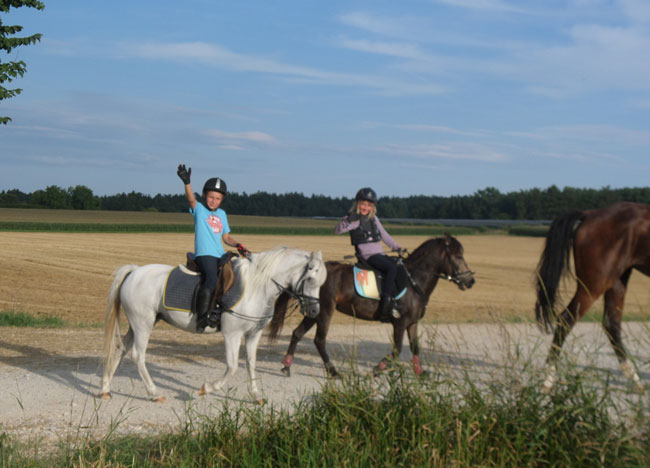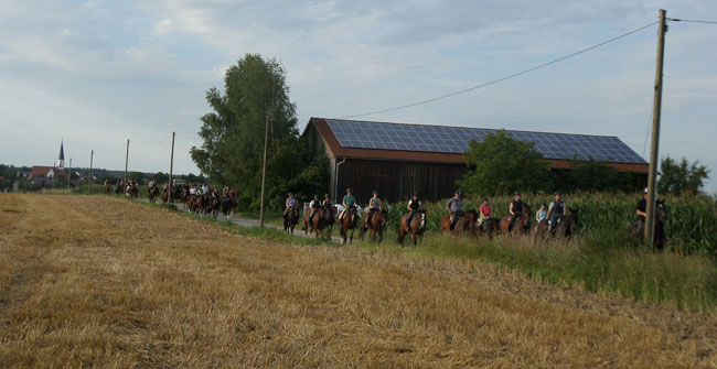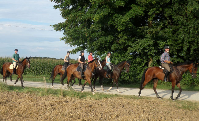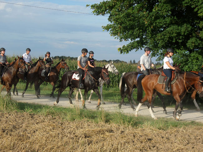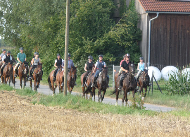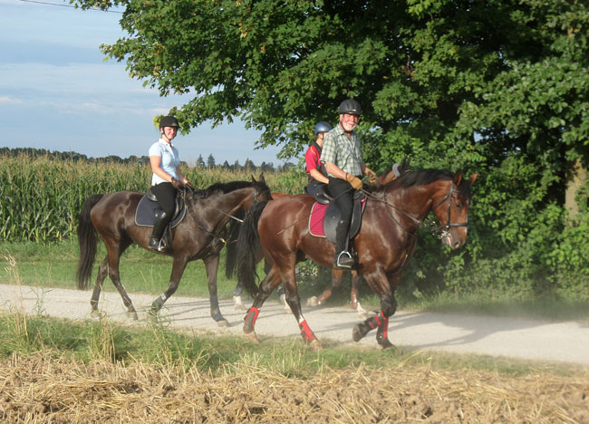 Sonntag, 10.08.14 - 1. Tag der Gruppe III Leider etwas verspätet die Berichterstattung zum dritten Kurs. Die Anmeldungen zu den Kursen lief bestens. Wie üblich waren Kurs eins und zwei schnell ausgebucht. Im Kurs drei waren bis zu Beginn der Training Plätze frei. Umso überraschter waren wir dann, als wir von Wolnzach zurück kamen und alle Boxen, bis auf zwei die als Sattelkammer verwendet wurden belegt. Und immer noch bekam Toni Anrufe, ob noch was frei wäre sie würden gerne kommen. So wurde noch eine Boxe frei gemacht und ein Kurzentschlossener untergebracht. Robert und Birgit führten deshalb den Sichtungsritt mit 40 Pferden und Reitern durch. Da in dieser Gruppe mehr Neulinge dabei sind gab es doch den einen oder anderen Freudensprung eines Pferdes.