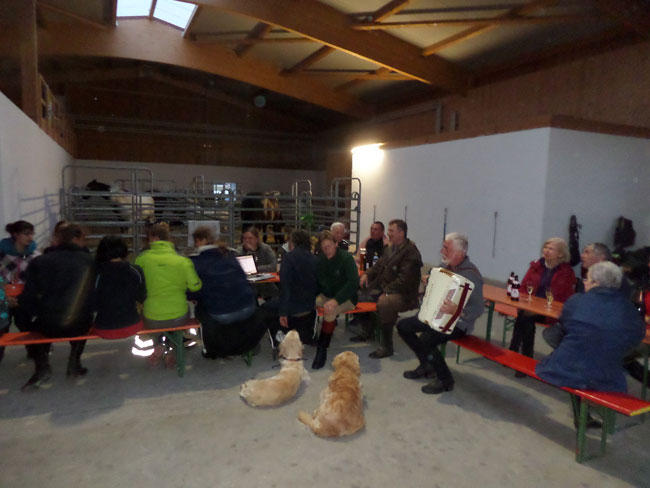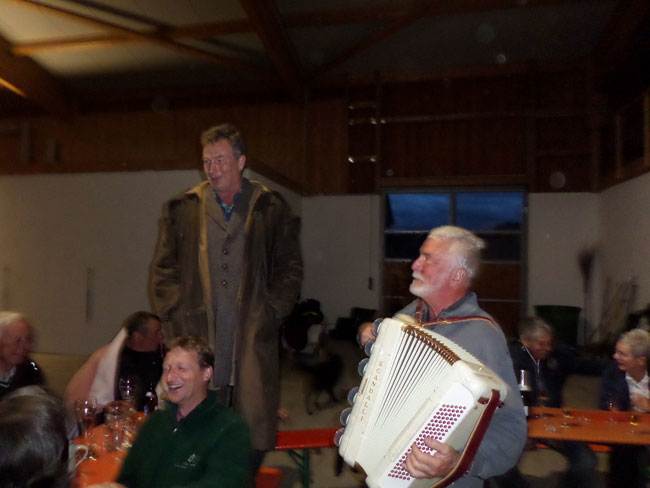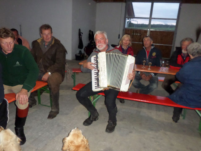 Mittwoch, 13.08.14 - 4. Tag Auch in der dritten Gruppe stand an diesem Tag die Graben-Wiese am Waldrand an Nur Fotos gibt es von den Aktivitäten dort nicht. Wir hatten für unser doch noch minderjähriges Foto-Team keinen Fahrer gefunden. Über den Nachmittag regnete es dann über 10 Liter. So vielen die Stoppelfelder für Schleppen fast komplett aus. Gut das wir doch so viel eigenen Wiesen Strecken haben um trotzdem Trainingsschleppen durchführen zu können. So konnte nur der letzte gemeinsame Abend bildlich festgehalten werden. Diesen Abend hatte man am Kennel gewählt. Mit entsprechender Kleidung und Schunkeln und natürlich etwas aufheizendes zum Trinken wurde es jedem warm. Das Essen hatten wir noch draußen eingenommen. Unser Kursteilnehmer Rolf gab auf dem Akkordeon sein bestes. Kaum zu glauben was er alles auf Lager hat.