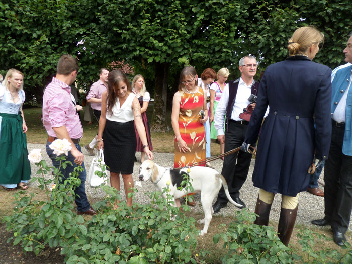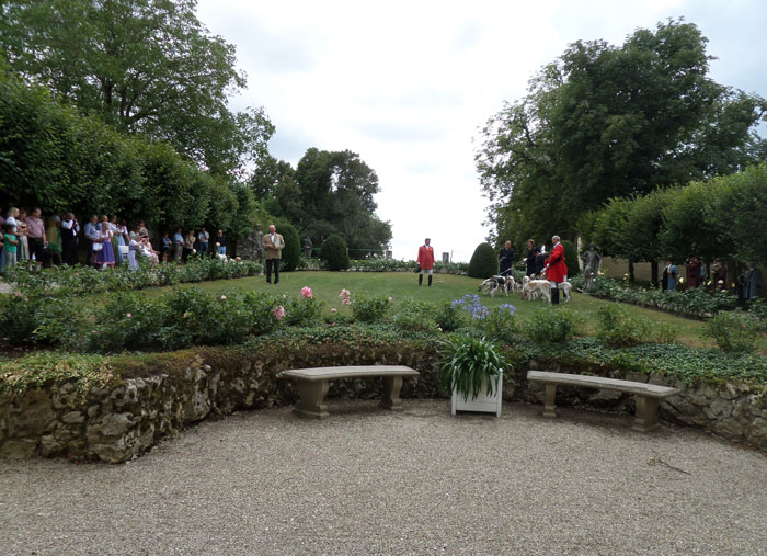 Auf der anderen Seite des Schlosses schließt dieser Garten an. Die Bläser wie die Zuschauer suchten den Schatten unter den Bäumen. Die Equipage mit den Junghunden in der Mitte.