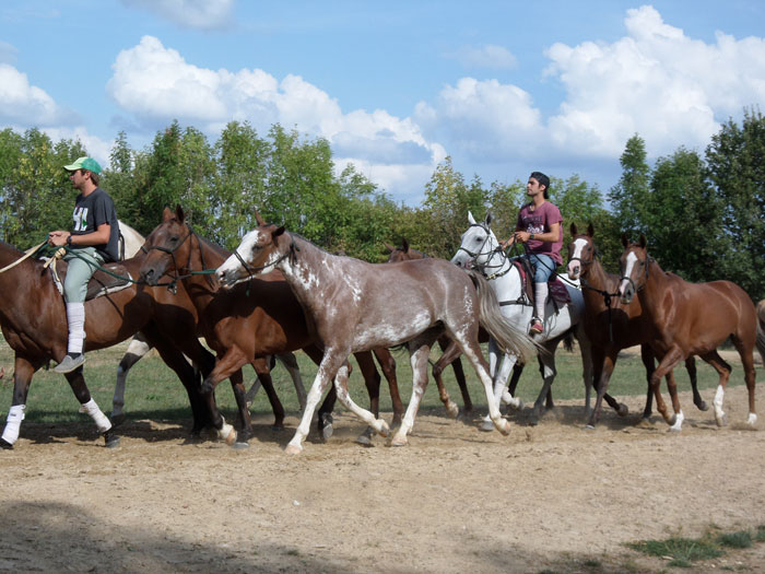 Wie beim Polo üblich reiten die Trainer eines und führen bis zu vier Pferde an der Hand mit. Zwei links, zwei rechts und immer um die Bahn.
