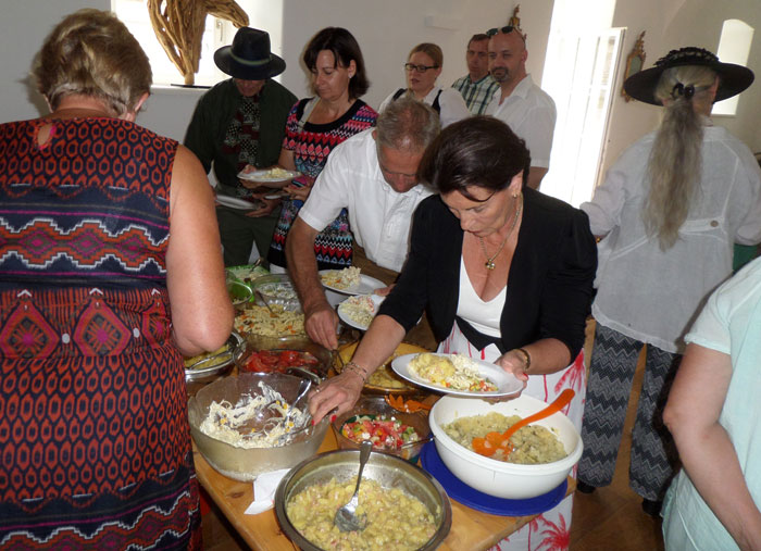 Zuerst drinnen Salat holen. Unsere Damen hatten die Kuchen mit Salaten ausgetauscht.