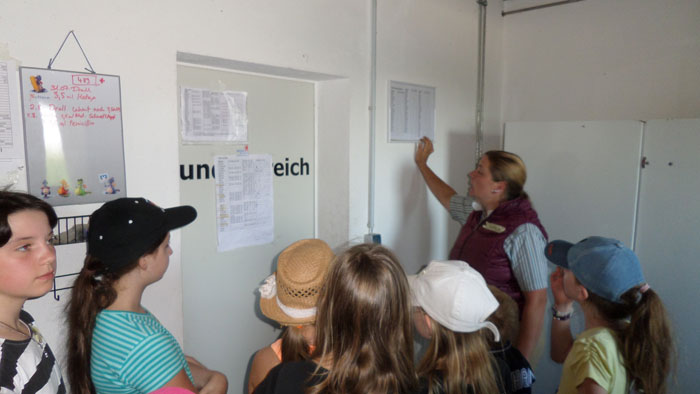 Hier in der Futterküche wo täglich das Futter für die Hunde vorbereitet wird. Carola erklärt anhand der Listen warum viele Hunde mit dem gleichen Anfangsbuchstaben beginnen und wie alt die Hunde sind und werden. Es gibt auch Listen wie viel und was die Hunde zu fressen bekommen.