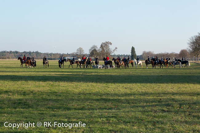 Bläsergruppen Aufstellung um Reiter – Pferde u. Meute beim