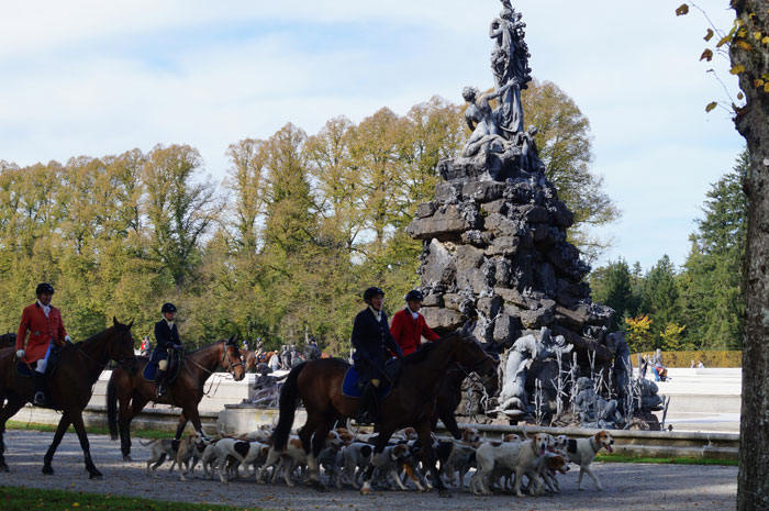 Equipage mit den 33 Foxhounds umrahmt vom Jagdfeld und bewundert von