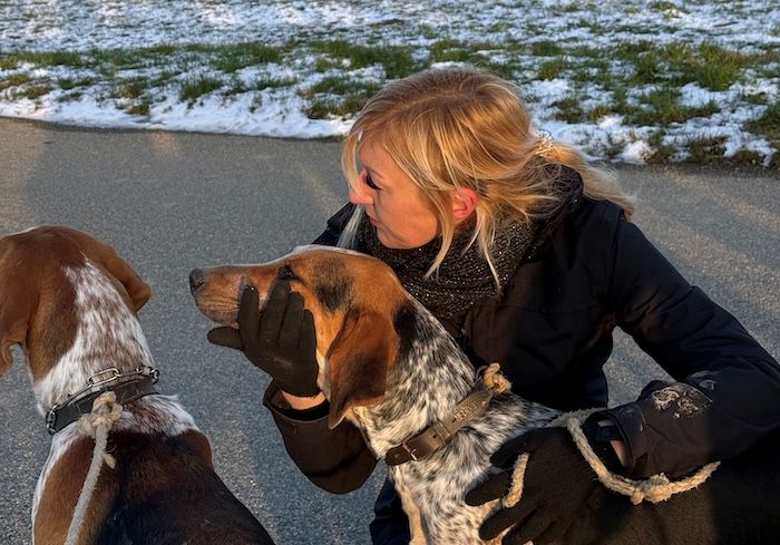 strahlendem Sonnenschein mit lebhaften Hunden spazieren zu gehen?