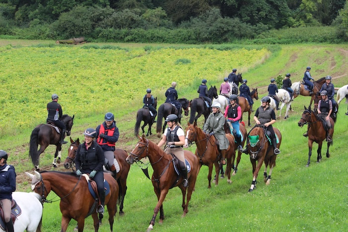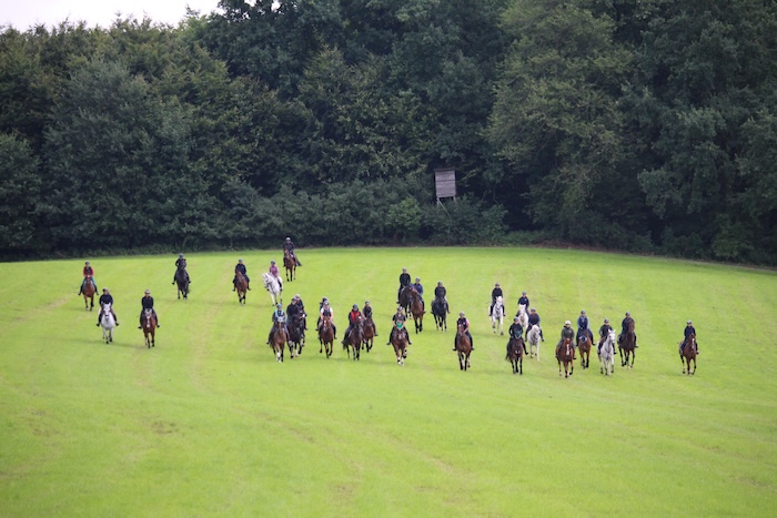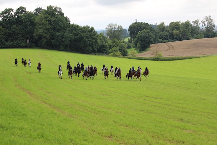 Schleppjagdtraining. Riesige Wiesen, ein hügeliges Gelände, viele